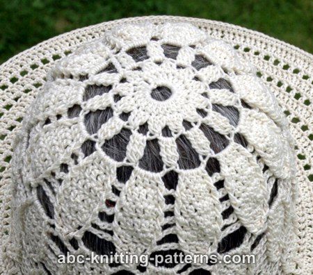 The crown of this hat features a bold acorn lace motif. It definitely makes a statement, and is also great for keeping off the sun. The hat is crocheted from the top down in one piece.