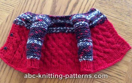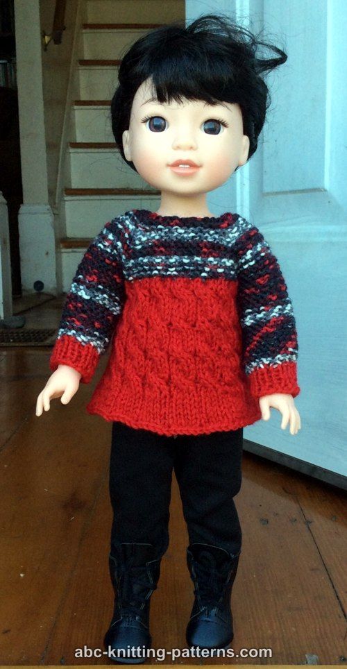 The solid-colored portion of the tunic is decorated with cables. It features a back closure for easy on-and-off with 14-inch dolls.