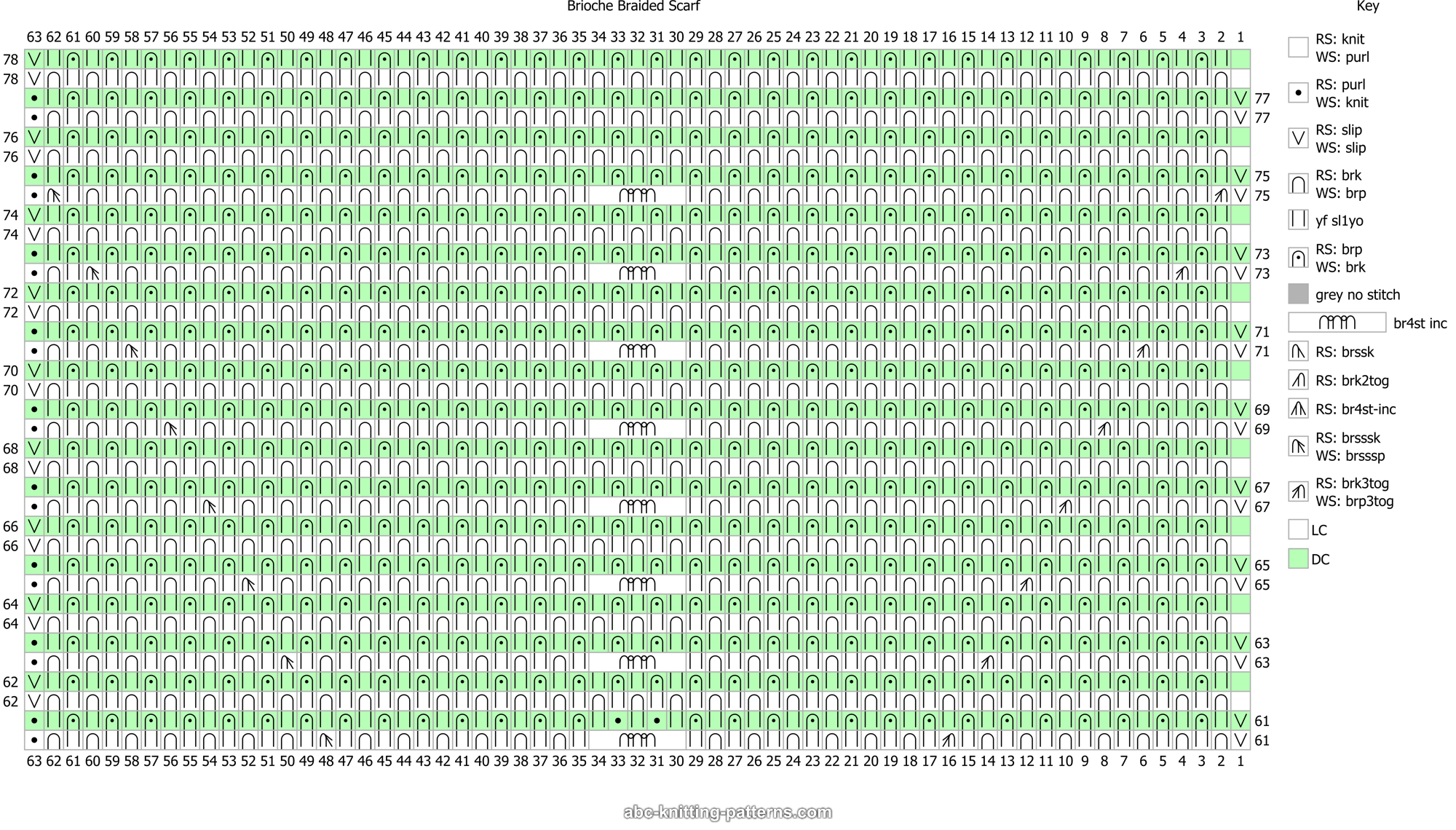 The scarf begins from the pointy end with a series of 4-st-increases in the center of the working piece in every 4th row until required width. Then the flat cable pattern is achieved by a combination of brioche decreases and increases. The pattern is repeated until the scarf is of desired length. The other pointy end is worked with 4-st-decreases in the center of the scarf in every 4th row, until 3 sts sre left.