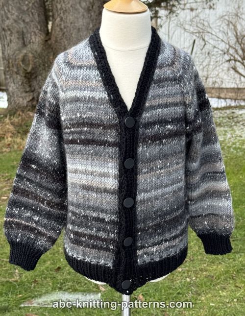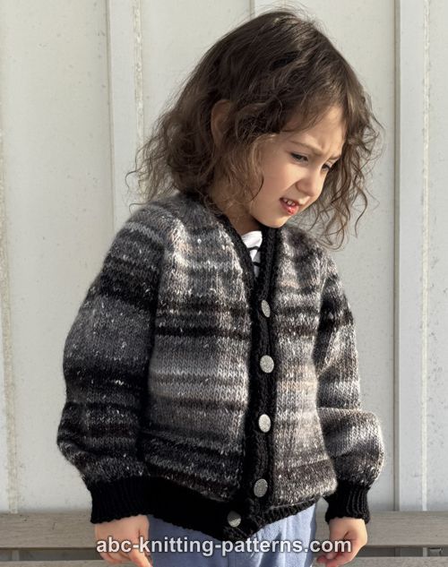The variegated yarn in the sample creates a fun, flowing gradient effect, as shown on the child model. With its classic shape and comfortable fit, this cardigan is wonderfully unisex and endlessly adaptable: choose bright solids for a playful pop, soft pastels for a sweet touch, bold stripes for extra energy, or any favorite color to match your child's unique style.